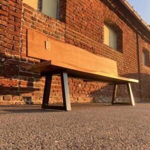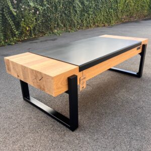 La structure est ensuite assemblée, pointée en soudure, les équerrages, les niveaux sont contrôlés. Le bois est présenté, ajusté si nécessaire. Puis la structure est définitivement soudée en soudure MIG ou à l’arc qui sont 2 techniques que je maitrise. Les soudures sont nettoyées, les soudures apparentes sont meulées pour obtenir le meilleur rendu possible. Certains éléments sont quand à eux rapportés vissés ou rivetés.